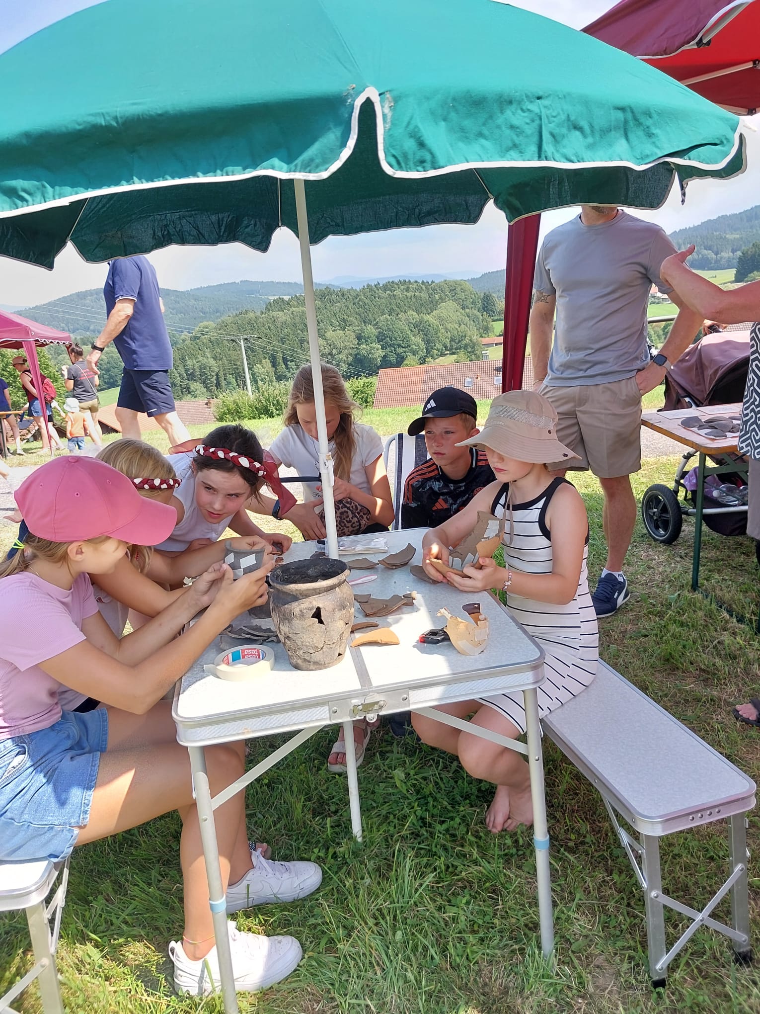 Vorstand Thomas Piller führte interessierte Besucher über das Burggelänge und informierte zur Geschichte und Sanierung der Burg. In diesem Zusammenhang wurden auch Fundstücke am Festplatz präsentiert und Kinder durften Scherbenteile zu Gefäßen zusammenfügen.